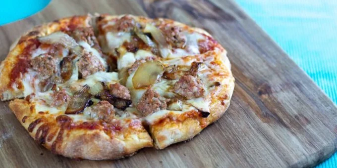 طرز تهیه پیتزا سوسیس با پیاز کاراملی و قارچ